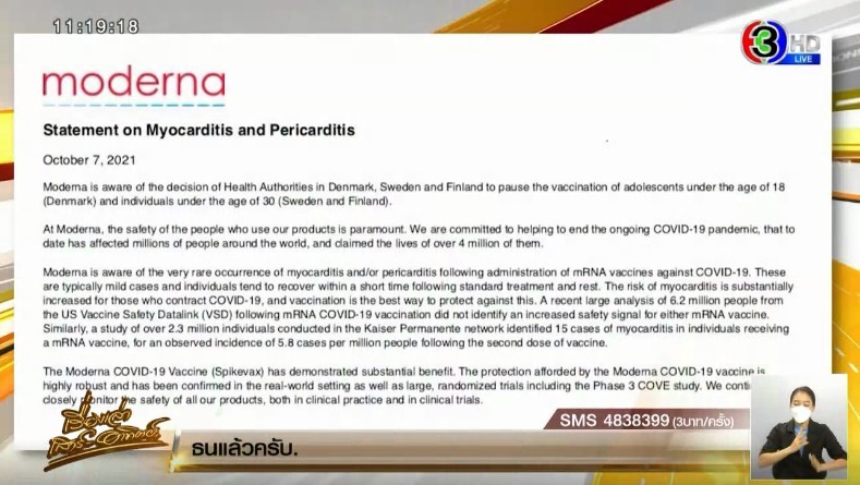 โมเดอร์นา ออกแถลงการณ์ รายงานว่าด้วยอุบัติการณ์การเกิดภาวะกล้ามเนื้อหัวใจอักเสบ และเยื่อหุ้มหัวใจอักเสบ ระบุว่า โมเดอร์นามีความตระหนักถึงประกาศจากกระทรวงสาธารณสุขของประเทศ เดนมาร์ก สวีเดน และฟินแลนด์ ที่แนะนำให้มีการหยุดฉีดวัคซีนป้องกันโควิด-19 ของบริษัทโมเดอร์นา เป็นการชั่วคราว ในกลุ่มประชาชนที่อายุตั้งแต่ 18 ปีลงมา ในประเทศเดนมาร์ก และกลุ่มประชาชนอายุตั้งแต่ 30 ปีลงมา ในส่วนของประเทศสวีเดน และฟินแลนด์