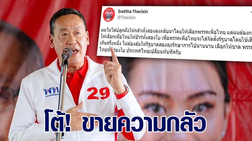 โดยระบุว่า “ผมไม่ได้ปลูกฝังให้กลัวทั้งสองลุงกลับมาโดยให้เลือกพรรคเพื่อไทย แต่ผมต้องการให้เลือกเพื่อไทยให้ชัวร์ทั้งสองใบ เพื่อพรรคเพื่อไทยจะได้จัดตั้งรัฐบาลโดยใช้เสียงเกินครึ่งหนึ่ง ไม่ต้องลุ้นให้รัฐบาลสองลุงรักษาการไปนานนาน เลือกให้ขาด พรรคเพื่อไทยทั้งสองใบ ประเทศไทยเปลี่ยนทันทีครับ”