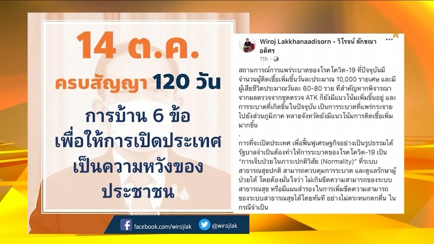 นายวิโรจน์ ลักขณาอดิศร โฆษกพรรคก้าวไกล ชี้ 14 ต.ค.นี้ ครบ 120 วัน ตามคำสัญญาเปิดประเทศของ พล.อ.ประยุทธ์ ชี้รัฐบาลจำเป็นต้องทำให้การระบาดของโควิด-19 เป็น “การเจ็บป่วยในภาวะปกติวิสัย (Normality) ที่ระบบสาธารณสุขปกติสามารถควบคุมการระบาด และดูแลรักษาผู้ป่วยได้