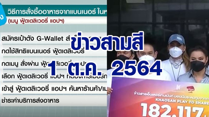 ข่าวสามสี 1 ต.ค. 64 - เงินคนละครึ่งรอบ 2 เข้าแอปฯเป๋าตัง 1,500 วันนี้ เปิดให้ใช้สั่งอาหารเดลิเวอรี่ 4 ต.ค.นี้