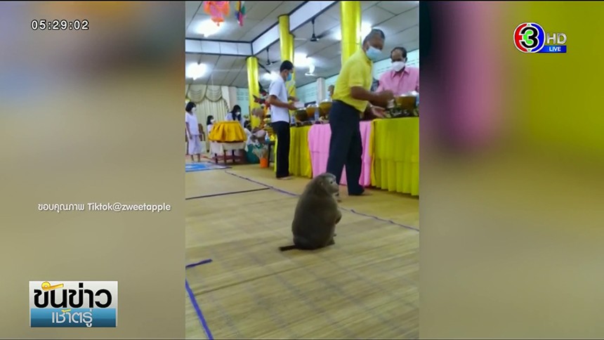 เจ้าจ๋อแสนรู้ นั่งรออาหาร ที่นำมาทำบุญอย่างมีมารยาท