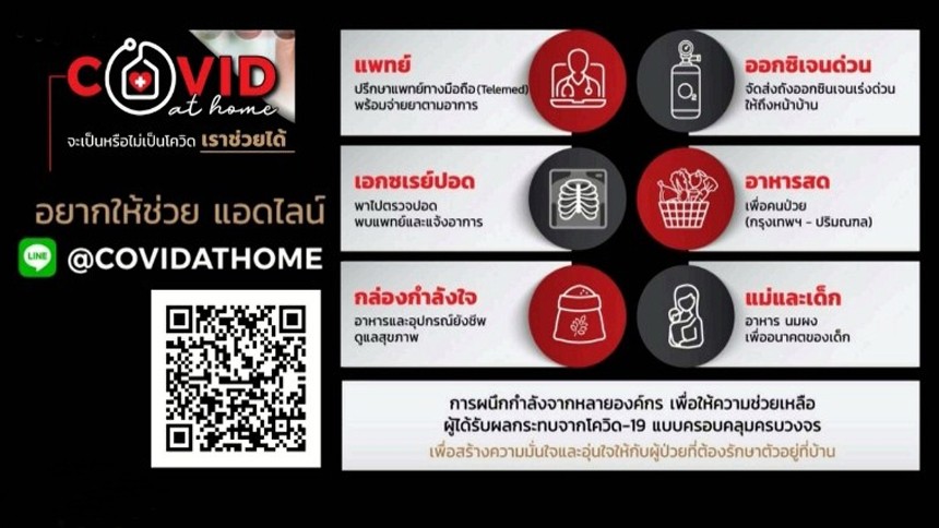 - ผู้ป่วยที่พักรักษาตัวอยู่ที่บ้าน ลงทะเบียนเพื่อรับ “อาหารด่วน" ได้ มีทั้งชุดอาหารสด (วัตถุดิบ เนื้อสัตว์ ผัก) , ชุดอาหารแห้ง และอาหารกล่องโดยเชฟกิ๊ก , iBerry Group และ ร้านคั่วกลิ้งผักสด