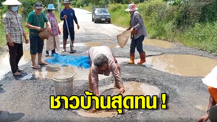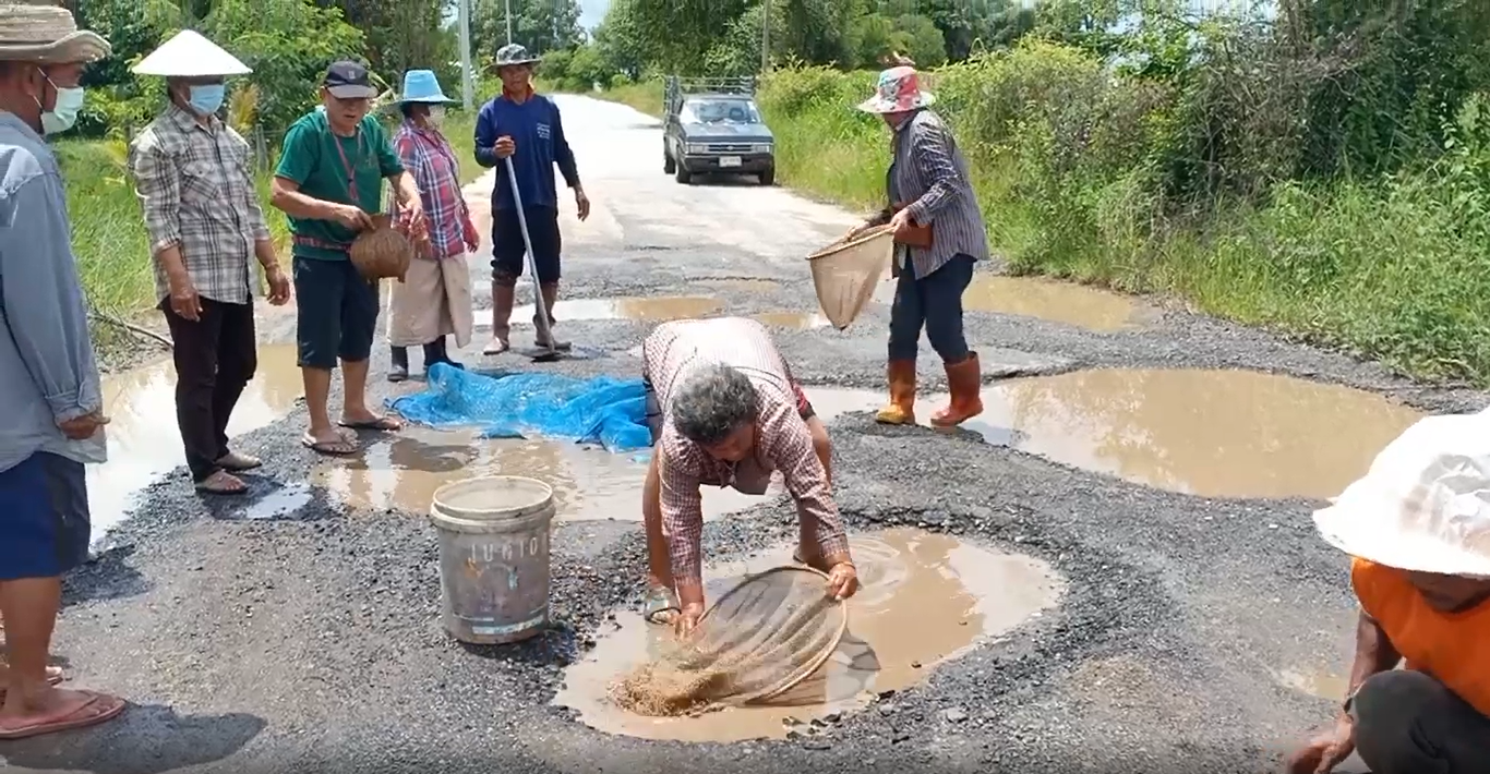 ชาวบ้านสุดทน! กระโจนลงหลุม หว่านแหจับปลา ประชดถนนพัง วอนหน่วยงานเข้าซ่อมแซม