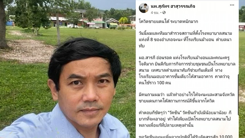 นพ.สุภัทร ฮาสุวรรณกิจ ผู้อำนวยการโรงพยาบาลจะนะ จ.สงขลา และประธานชมรมแพทย์ชนบท เขียนข้อความทางเฟซบุ๊ก เล่าว่า ขณะนี้การติดเชื้อโควิดของจังหวัดชายแดนใต้ ระบาดหนัก ขอวัคซีนเพิ่มจากปกติที่ได้รับจัดสรรสัก 10,000 โดสต่ออำเภอ จึงจะเอาอยู่