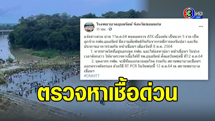 โดยท่านใดที่อยู่นอกเขต กฝผ. และได้ลงหาปลาหน้าเขื่อนในช่วงดังกล่าว ให้มาตรวจหาเชื้อโควิด-19 ที่โรงพยาบาลอุบลรัตน์ ในวันนี้ 12 ต.ค. 64