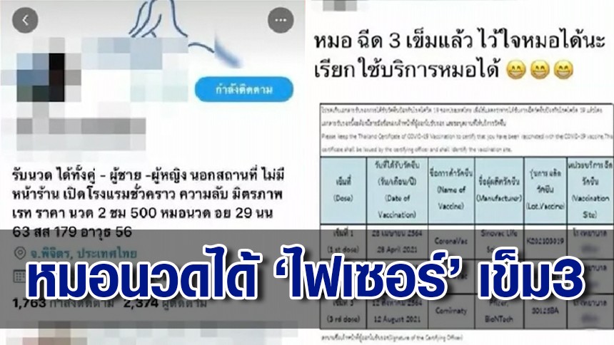 จากกรณีทวิตเตอร์ร้านนวดแห่งหนึ่งใน จ.พิจิตร ทวีตข้อความระบุว่า "หมอฉีดเข็ม 3 แล้ว ไว้ใจหมอได้นะ เรียกใช้บริการหมอได้" พร้อมโชว์เอกสารการฉีดวัคซีนเข็ม 3 โดย 2 เข็มแรกเป็นวัคซีนซิโนแวค ส่วนเข็ม 3 เป็นวัคซีนไฟเซอร์ ฉีดเมื่อ 12 ส.ค.ที่ผ่านมา ที่โรงพยาบาลแห่งหนึ่ง