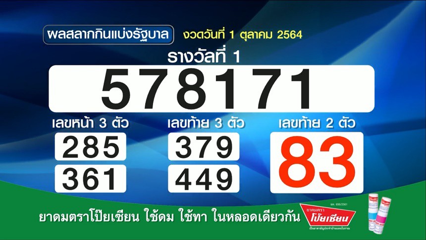 ผลสลากกินแบ่งรัฐบาล งวดวันที่ 1 ตุลาคม 2564
