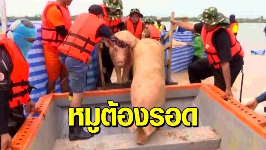 จากนั้นเจ้าหน้าที่ ปภ. ทหาร เคลื่อนย้ายหมูนำขึ้นฝั่ง แล้วช่วยกันนำผ้าใบมาปิดล้อม ช่วยกันจับและต้อนหมูลงจากเรือขึ้นรถบรรทุก ไปไว้สถานที่ของฟาร์มอีกแห่งหนึ่ง บางตัวพอขึ้นถึงฝั่งวิ่งหนีเตลิด จนเจ้าหน้าที่ต้องวิ่งไล่จับจ้าละหวั่นกว่าจะต้อนหมูขึ้นรถบรรทุกได้เจ้าหน้าที่เหนื่อยหอบไปตาม ๆ กัน โดยทำการเคลื่อนย้ายหมูให้ได้มากที่สุด เพื่อไม่ให้มันจมน้ำตายอีก ส่วนตัวที่ตายจะขนย้ายนำไปฝังกลบ