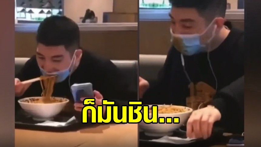 ก็มันชิน...หนุ่มกินบะหมี่ ลืมตัวตักเข้าปาก แบบไม่ถอดแมสก์ งานนี้ก็เลอะสิ