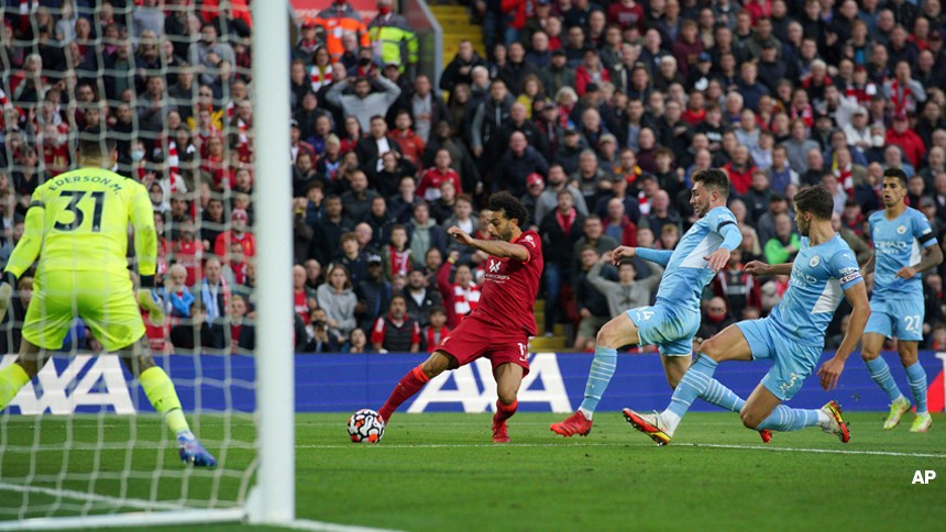ผลฟุตบอลพรีเมียร์ลีก อังกฤษ ฤดูกาล 2021/22 เมื่อคืนวันอาทิตย์ที่ 3 ต.ค.64 บิ๊แมตช์คู่ระหว่าง ลิเวอร์พูล รับการมาเยือนของ แมนเชสเตอร์ ซิตี้ จบครึ่งแรกยังเสมอกันอยู่ 0-0