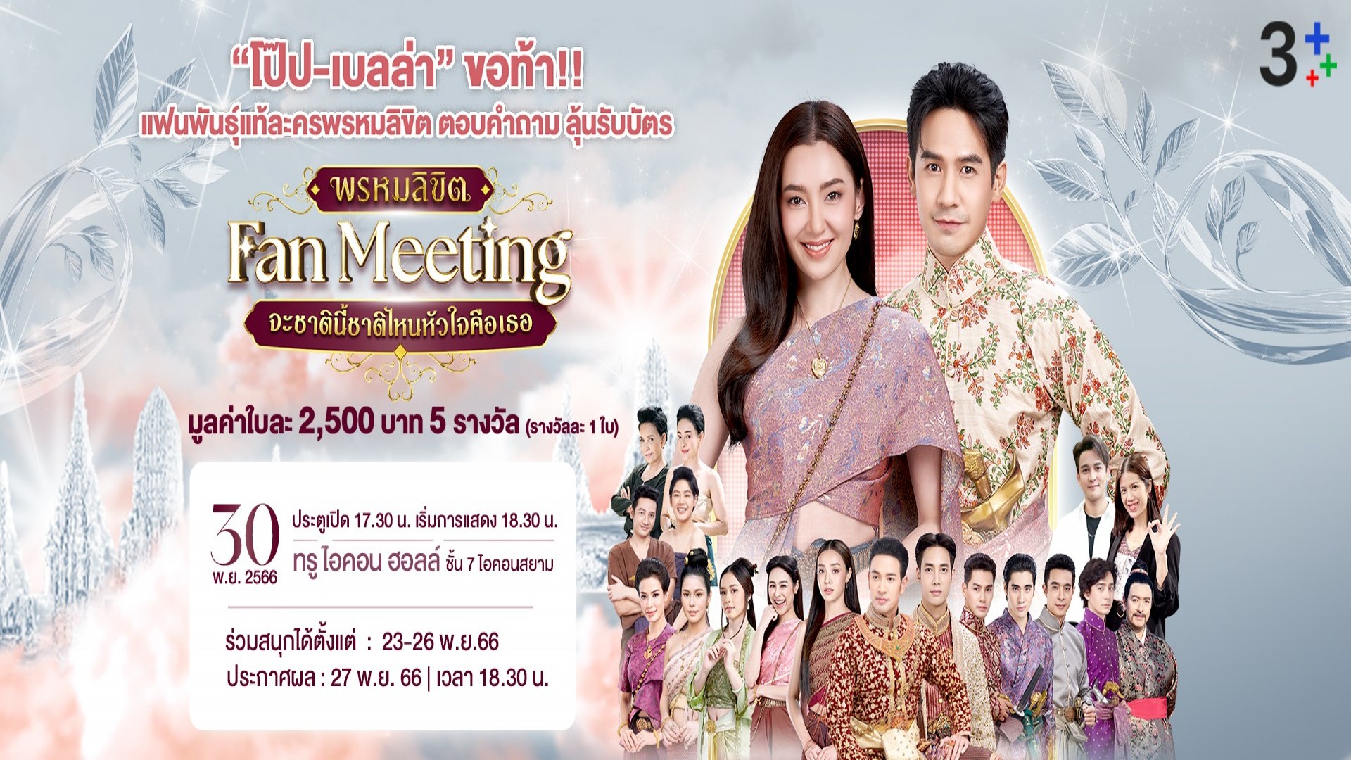 ลุ้นเป็นผู้โชคดีได้รับบัตร “พรหมลิขิต FAN MEETING จะชาตินี้ชาติไหนหัวใจคือเธอ” ท่านละ 1 ใบ มูลค่าใบละ 2,500 บาท ทั้งหมด 5 รางวัล