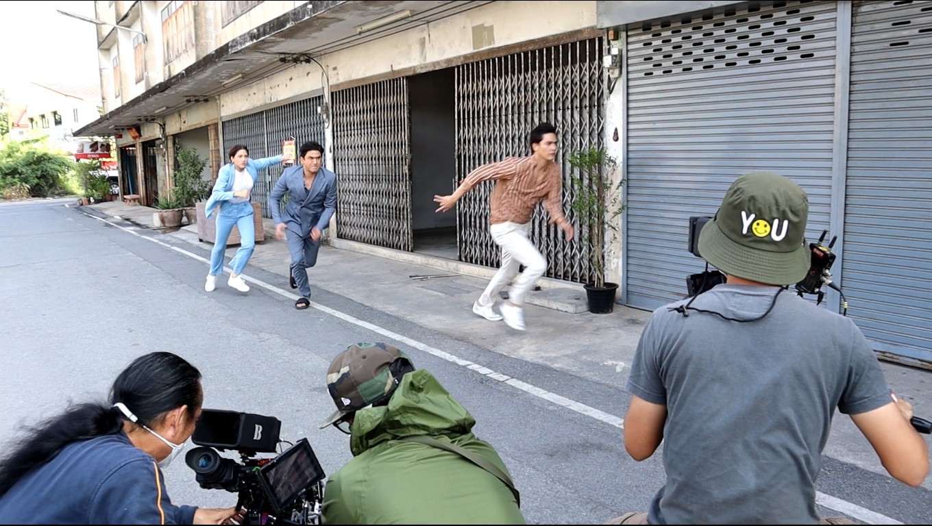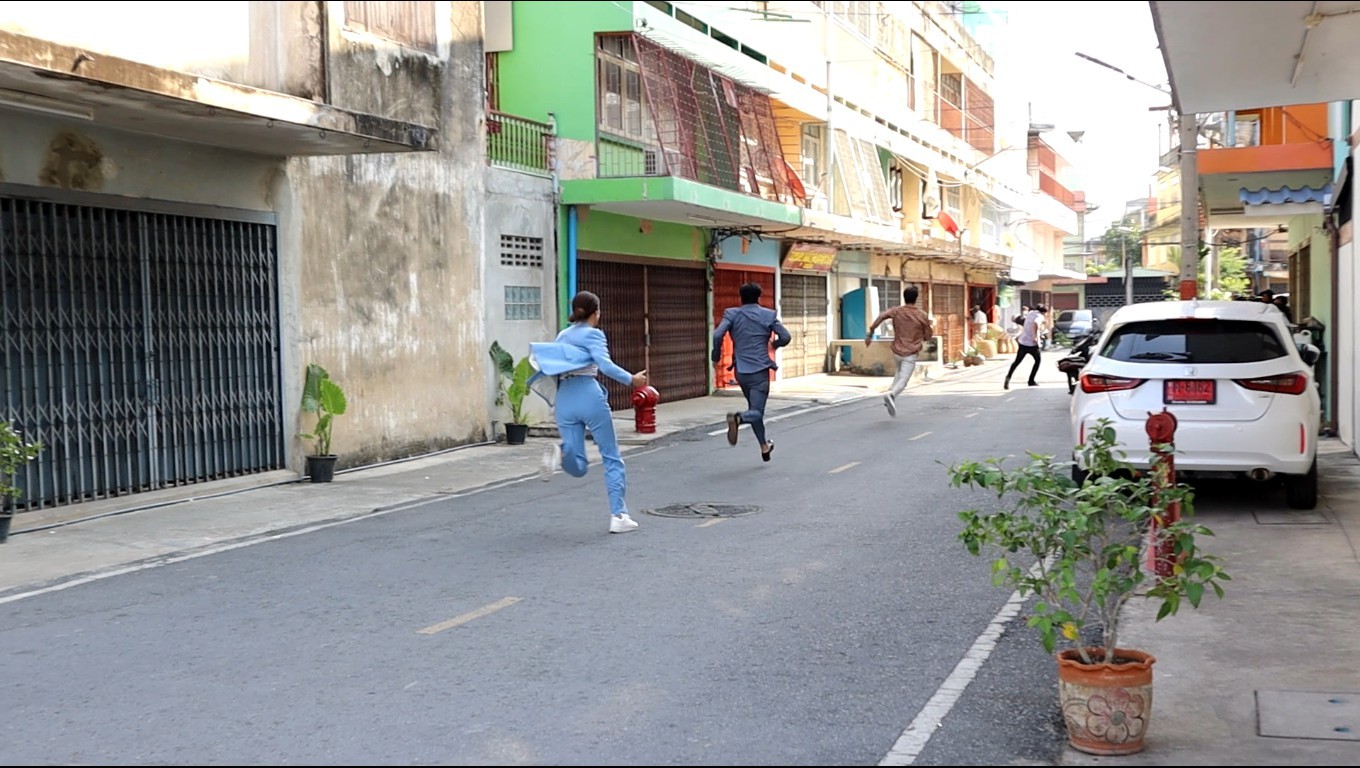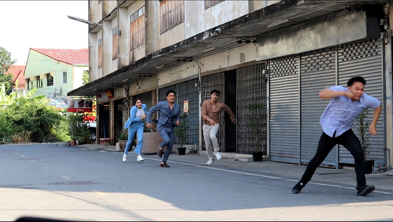 เริ่มซ้อมทุกคนก็แทบร่วงเพราะถ่ายกลางแดดเปรี้ยงและวิ่งแบบยาวๆเก็บภาพกว้าง ทั้งสามคนใส่กันไม่ยั้ง วิ่งแบบลืมเหนื่อย พรีมที่ดูจะอ่อนแอสุดเพราะเป็นผู้หญิงก็รั้งท้ายเป็นธรรมดา พอสักสองรอบไปแล้วพรีมขอต่อรองให้ทุกคนช่วยวิ่งช้าๆ หน่อย หลังถ่ายคัทแรกผ่านไปเราก็ได้เห็นพลังในการสับเท้าของป๋อชนิดที่รองเท้าเปิดเล็บฉีกกันเลย เพราะเป็นคนเดียวที่ต้องใส่รองเท้าหนัง (เหมือนทีมงานแกล้ง แต่บังเอิญมันต่อเนื่องมาแล้วเปลี่ยนไม่ได้) พอถ่ายคัทแคบๆ เราก็จะได้เห็นป๋อใส่รองเท้าแตะเล่นแบบฮาๆ ฉากนี้ต้องบอกเลยว่า ทั้งป๋อ ไอซ์ พรีมวิ่งกันจนลมแทบจับกว่าจะได้ฉากไล่ล่าสวยๆ มาฝากทุกคน ตบท้ายด้วยบู๊ของป๋อกับโจรแบบเท่ๆ อีกชุดใหญ่ คนที่เหนื่อยคือป๋อ คนที่ลุ้นคือพรีมกับไอซ์ จนมีคนแซวว่า แทนที่ป๋อจะสบาย ได้รับการดูแลเพราะเป็นรุ่นใหญ่ ปล่อยให้เด็กๆ รับหน้าที่หนักไป แต่กลายเป็นคนแก่เหนื่อยให้เด็กๆ ดู โถๆๆๆๆ เอ็นดูป๋อจริงๆ แต่ฉากนี้ถ้าไม่ใช่ป๋อก็ไม่รู้ว่าจะได้ทั้งภาพและความสนุกขนาดนี้หรือไม่