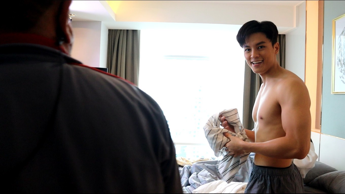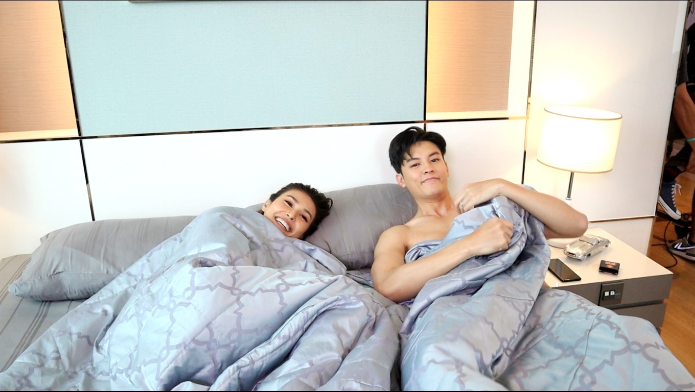 เริ่มถ่ายจริงมาสุกับโบว์ก็นัวกันบนเตียง ยังไม่ทันจะไปถึงไหน ผกก.สั่งคัทเสียงดังลั่นห้อง บอกโบว์ว่าให้ลูบไล้ที่หลัง ไม่ใช่นอนเกาหลังให้ลูก จากฉากเสียวกลายเป็นฉากฮาไปแล้ว หลังจากปรับลีลาของโบว์เสร็จ ถ่ายต่อ รับฝั่งแคร์เข้ามาเจอ มาสุต้องตกใจรีบลุกใส่กางเกง จังหวะกล้องกับคนไม่สัมพันธ์กัน ใส่ๆ ถอดๆ กางเกงอยู่หลายรอบ มาสุถึงกับบ่นว่าเล่นจนงง ใส่ๆ ถอดๆ จนเข่าอ่อน แล้วก็ดึงดราม่าเรียกร้องขอความเห็นใจว่า “ฉากนี้ผมเป็นผู้ถูกกระทำ ควรสงสารผมนะครับ” พร้อมบีบน้ำตาเล่นใหญ่ไปอีก โบว์บอกว่า เล่นกับมาสุสบายมาก นอกจากไม่เขินแล้ว เห็นมาสุก็เหมือนเห็นน้องหรือหลานชายตัวเองถอดกางเกง รู้สึกเอ็นดูความเด็กน้อยของมาสุ คราวนี้เกมพลิก คนที่เขินกลายเป็นมาสุที่พยายามจะเล่นเร่าร้อน แต่คู่นอนดันมองเป็นเด็กน้อยไปซะแล้ว น่าเอ็นดูจริงๆ